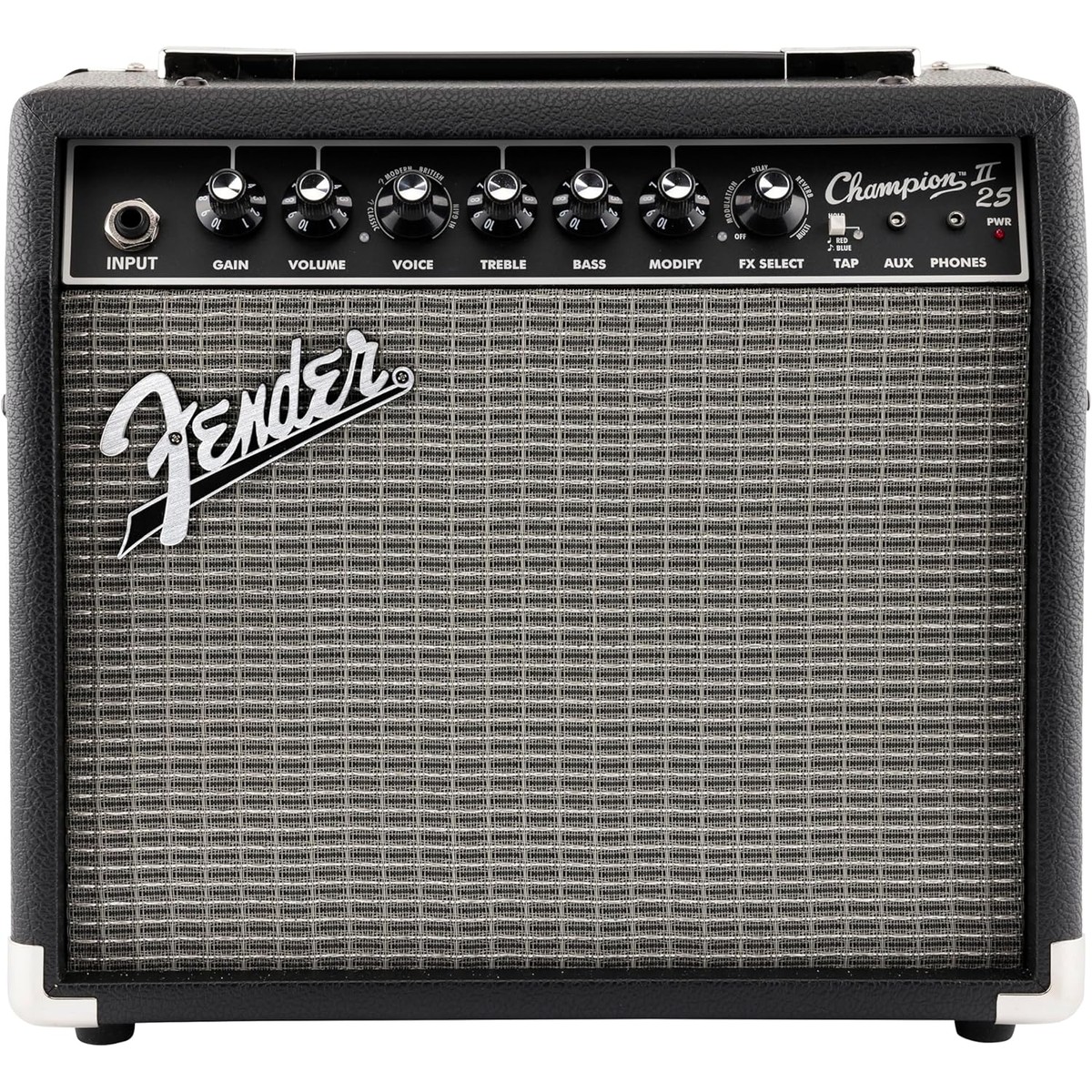 The Fender Champion 25 Guitar Amp 230V UK is a compact 25 watt combo that makes getting a great sound simple. Ideal for beginners, returning players and anyone who wants classic Fender tones at home or in the rehearsal room, it offers an easy path from clean practice to driven rock sounds without fuss. Plug in, set a clean or crunch voice, add a touch of reverb or delay and you are making music in seconds. Its portable size, straightforward controls and dependable solid state design make it a practical choice for everyday playing, songwriting, teaching and small jam sessions where reliability and clarity matter.